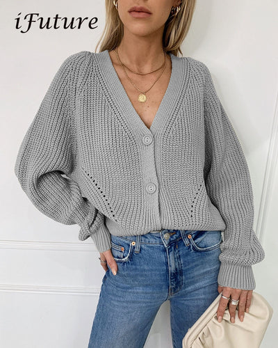 Cardigan Sweaters Tops Women 2020 Autumn New Knit Loose Casual Solid Color V-neck Lantern Sleeves bat Sleeves Button Jacket