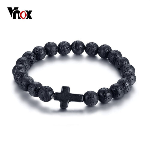 Vnox Volcanic Energy Lava Stone Black Red Cross Charm Bracelets for Women Men Yoga Beads Couple Jewelry Stretch Pulseira