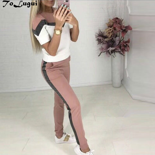 ToLugui Summer Women's Set short sleeve Sports Suit patchwork o-neck t-shirt+pant 2 piece set tracksuit for women sweat suit
