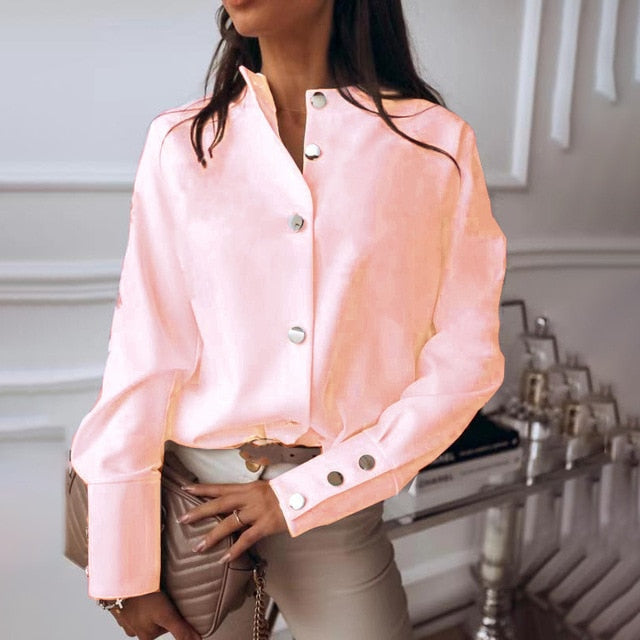 Autumn Elegant White Shirts Women Buttons Stand Collar Single Breasted Female Shirt Female Metal 2020 Winter Fashion Ladies Tops