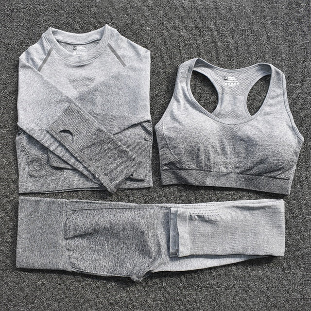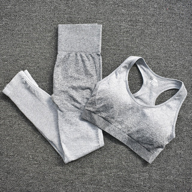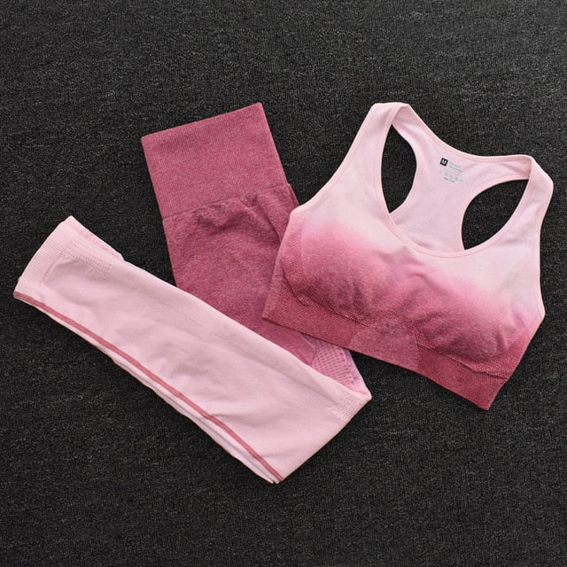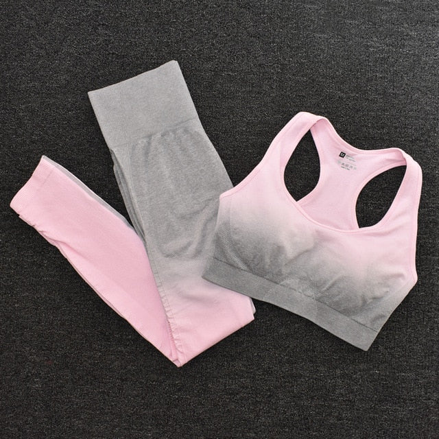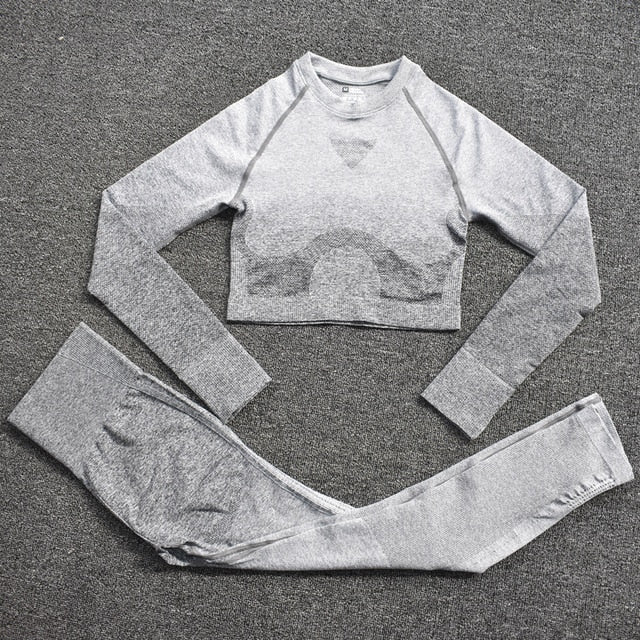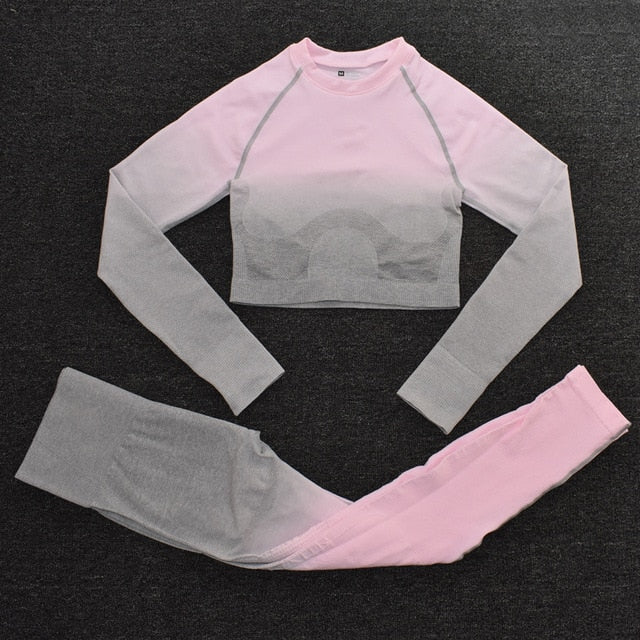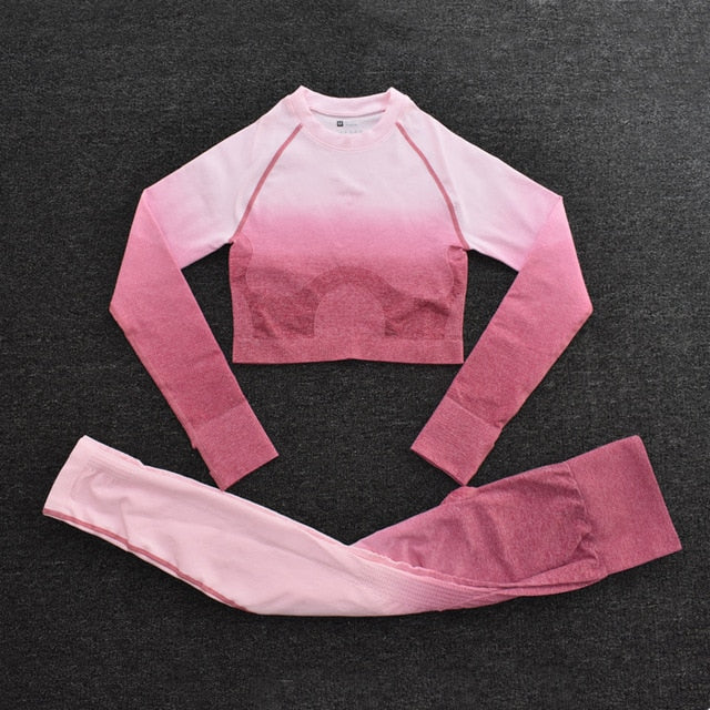 Ombre Women Yoga Set Seamless Leggings Long Sleeve Crop Top Sports Bra Running Pants Gym Clothing Fitness Workout Sports Suit